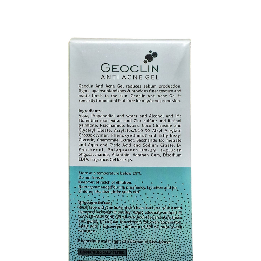 Geoclin Anti Acne Gel reduces sebum production, fights against blemishes & provides finer texture and matte finish to the skin. Geoclin Anti Acne Gel is specially formulated & oil free for oily/acne prone skin. Geoclin Anti Acne Gel is an advanced formula designed to combat acne effectively. Additionally, this germicidal gel cleanses the skin, ridding it of harmful germs. Say goodbye to acne troubles with Geoclin